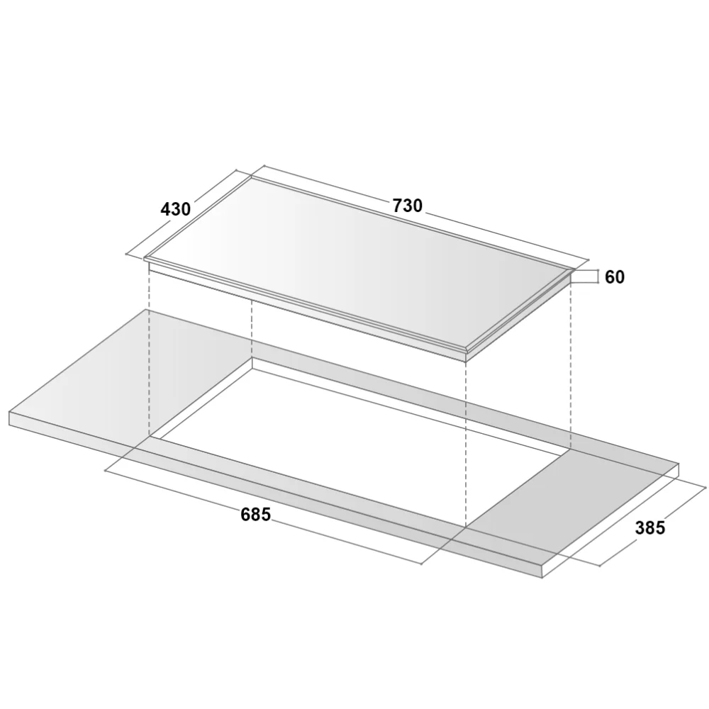 - Kích thước bếp: 730 mm (R) x 430 mm (S) x 56 mm (C)