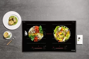 - Bếp trang bị bảng điều khiển 2 phím Slider với 9 mức công suất dễ thao tác, kèm các chức năng đa dạng như giữ ấm (Reheat), chiên xào với 3 mức nhiệt, hẹn giờ độc lập cho từng vùng nấu.
