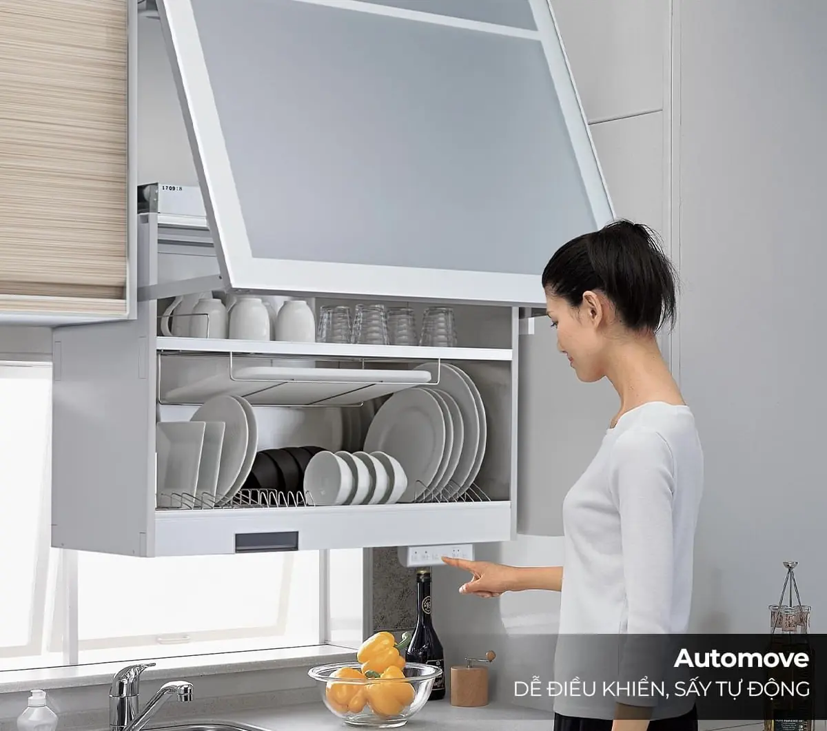 - Nâng hạ điện tự động: Điều khiển bằng nút bấm điện tử, giúp việc úp và lấy bát đĩa trở nên nhẹ nhàng, tiện lợi cho mọi đối tượng.