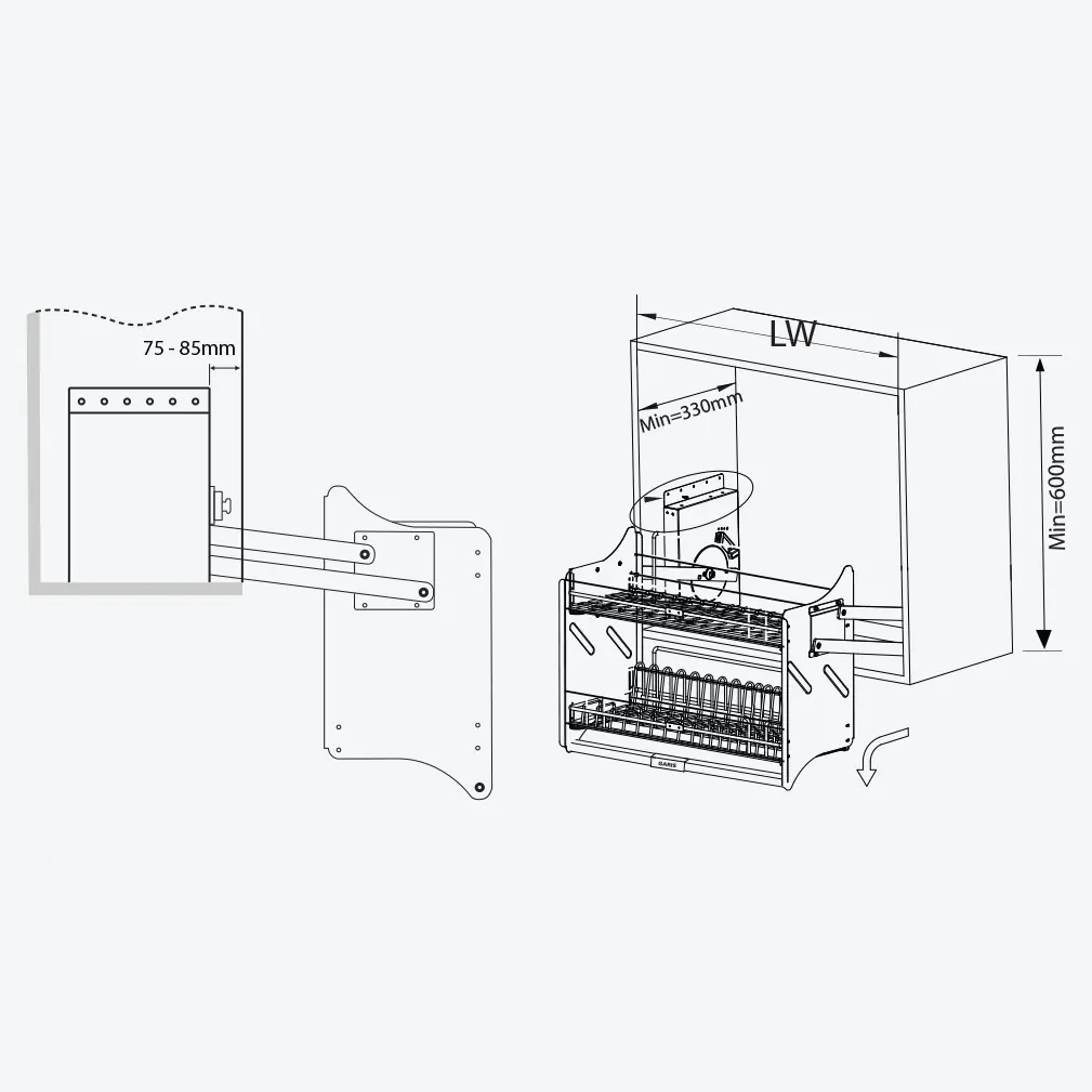• Kích thước lọt lòng tủ (Rộng x Sâu lọt lòng tủ x Cao lọt lòng tủ): R664 x S ≥ 265 x C ≥ 550 mm.