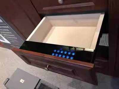 Thiết kế dạng ngăn kéo lắp âm tủ, giúp giấu kín két sắt, đảm bảo tính thẩm mỹ và an toàn cao khi sử dụng