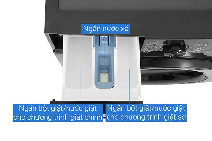 - Ngăn chứa nước giặt và nước xả bố trí khoa học: Giúp phân bổ chất giặt xả đều trong suốt chu trình, đồng thời thuận tiện cho việc vệ sinh sau thời gian dài sử dụng.