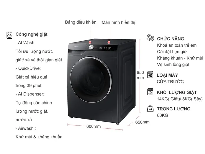 - Bên cạnh đó, giặt hơi nước Hygiene Steam và Airwash mang lại cảm giác quần áo sạch thoáng, dễ chịu hơn, nhất là với những người có làn da nhạy cảm hoặc gia đình có trẻ nhỏ. Bảng điều khiển AI Control song ngữ Việt – Anh cũng góp phần tạo trải nghiệm thân thiện, dễ làm quen ngay từ lần đầu sử dụng.