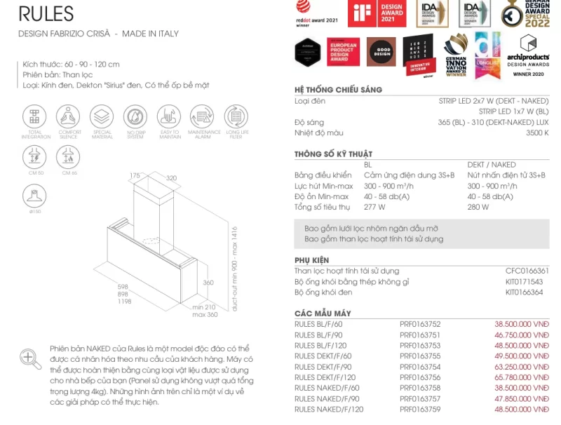 Thông Số Kỹ Thuật Máy hút mùi Elica RULES DEKT/F/60 PRF0163755