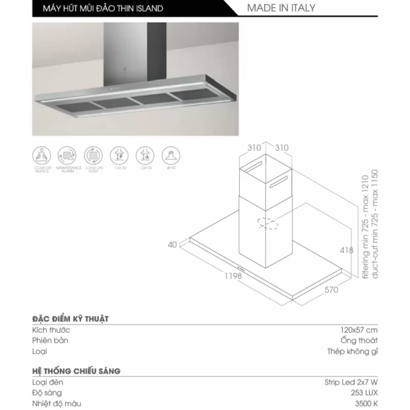 Thông Số Kỹ Thuật Máy hút mùi Elica THIN ISLAND IX/A/120 PRF0144973