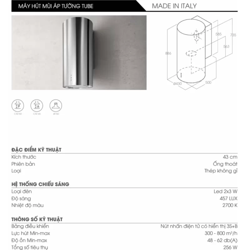 Thông Số Kỹ Thuật Máy hút mùi Elica TUBE IX/A/43 PRF0007783A