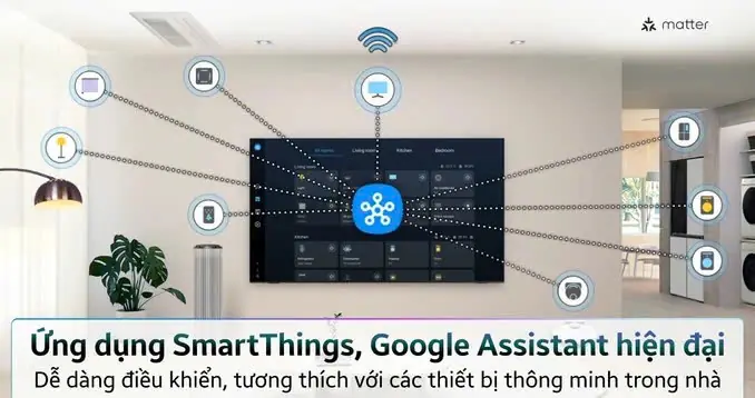 Thiết kế AirSlim thanh thoát và viền gần như không viền khiến TV trở nên hiện đại, tinh tế và dễ hòa hợp với mọi không gian nội thất. Hệ điều hành Tizen OS trực quan, dễ sử dụng, đi kèm các tính năng thông minh như Bixby, SmartThings, Universal Gestures, Quick Remote, AirPlay 2 và Art Store giúp TV vừa là thiết bị giải trí vừa trở thành điểm nhấn nghệ thuật trong phòng khách.