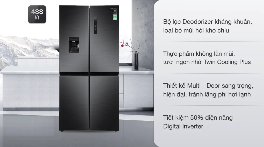 - Dung tích sử dụng: 488 lít, phù hợp cho gia đình từ 4–5 người