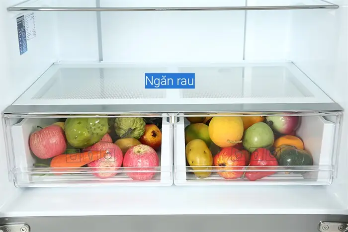 - Ngăn rau củ rộng rãi được bố trí khoa học, tạo môi trường bảo quản tối ưu cho rau quả luôn tươi giòn. Trong khi đó, hộc ngăn đá lớn giúp sắp xếp thực phẩm đông lạnh ngăn nắp, dễ tìm và dễ lấy.